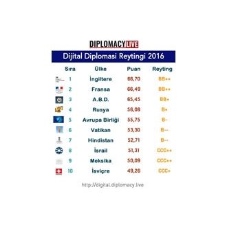 Dijital Araştırmalar Derneği’nin dijital diplomasi projesi olan Diplomacy.Live, dünyadaki 210 ülkenin Dışişleri Bakanlığı’nın 1098 dijital varlığını mercek altına alarak gerçekleştirdiği sıralamanın sonuçlarını açıkladı. 45 kategori ve 166 kriter ışığında ölçümlenen Dijital Diplomasi Reytingi 2016 Araştırması kapsamında 210 ülkenin dışişleri bakanlıklarına ait 195 web sitesi, 13 blog, 53 RSS, 43 mobil uygulama ve 33 sosyal ağda toplam 742 hesap/kanal incelendi. 210 bakanlığın 166’ı en az bir Twitter hesabına, 120’si ise en az bir Facebook hesabına sahip. Sadece 77 dışişleri bakanının ise Twitter hesabı bulunuyor.