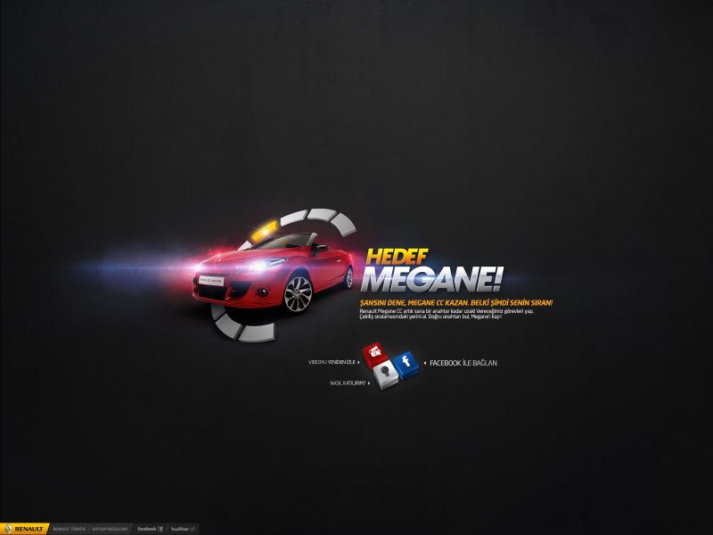 Türkiye’nin en büyük dijital ajansı 41?29! tarafından Renault için tasarlanan “Hedef Megane” projesi, bir kişiye Kareem Abdul-Jabbar, Horace Grant ve Mehmet Okur’un imzalı Megane CC kazandıracak. 13 Aralık’ta www.hedefmegane.com internet sitesi aracılığıyla başlayan uygulama, yalnızca bir robot ve bilgisayar tarafından kontrol ediliyor. Anahtar havuzundan bir Megane CC anahtarı çekmeye programlanan robot, bilgisayar başındaki katılımcılar için bir anahtar çekiyor. Çekilen anahtarın Megane CC’nin kapısını açması halinde, kullanıcı anında otomobilin sahibi oluyor!