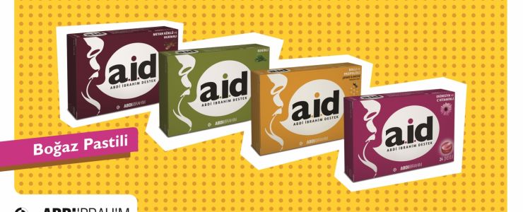 Abdi İbrahim’in en yeni ürünü bitkisel boğaz pastili “a.i.d” çeşitli bitkisel özlerin kullanılması ile oluşturuldu. a.i.d Boğaz Pastili ailesinde; Ballı ve Propolisli pastilin yanı sıra Ekinezya ve C vitaminli, Meyan köklü ve Trabzon hurması aromalı ile Kekikli olmak üzere 4 farklı ürün bulunuyor.