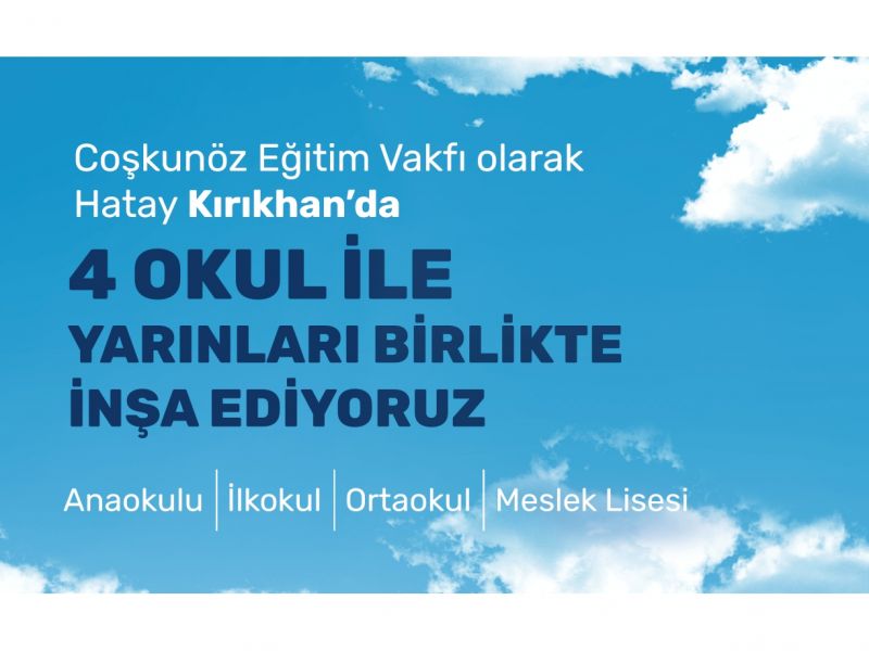 Deprem felaketinin ardından afet bölgesine destek için ilk andan itibaren seferber olan Coşkunöz Eğitim Vakfı, deprem sonrası bölgedeki yardım faaliyetlerini sürdürüyor. Kurulduğu günden bu yana 35.000 bireyin hayatına dokunan Coşkunöz Eğitim Vakfı, Hatay’ın Kırıkhan ilçesinde öğrencilerin eğitimlerine devam edebilmeleri için bir eğitim kompleksi hayata geçiriyor. Vakıf Millî Eğitim Bakanlığı ile imzalanan protokol kapsamında farklı yaş gruplarından anaokulu, ilkokul, ortaokul ve gıda teknolojileri meslek lisesi olmak üzere 4 adet okul inşa ediyor. Eğitim kompleksi, 2023-2024 eğitim öğretim yılının başlamasıyla birlikte hizmete açılacak. Çelik konstrüksiyon olarak inşa edilecek okulların mimari tasarımları, Hatay’ın geleneksel mimarisinden izler taşıyacak. 4 yeni okul binasında yaklaşık 1000 öğrencinin eğitim alması planlanıyor.