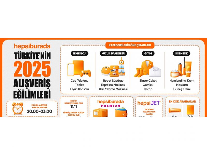 Hepsiburada, 2025 yılı boyunca platformunda verilen milyonlarca siparişi inceleyerek Türkiye’deki alışveriş alışkanlıklarına dair kapsamlı veriler paylaştı. Yıl boyunca teknoloji kategorisinde cep telefonu, tablet ve oyun konsolu en çok ilgi gören ürünler arasında yer aldı. Küçük ev aletleri kategorisinde robot süpürge, espresso makinesi ve halı yıkama makineleri öne çıktı. Giyim kategorisinde blazer ceket, gömlek ve çorap yıl boyunca tüketicilerin en çok tercih ettiği ürün grupları arasında yer aldı. Kozmetik kategorisinde ise nemlendirici krem, maskara ve güneş kremi 2025’in öne çıkan ürünleri oldu.