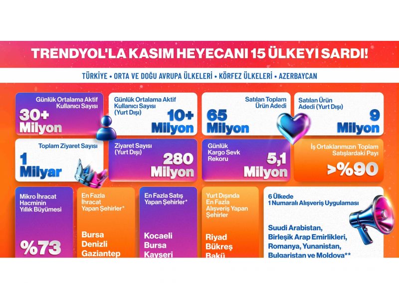 Trendyol ayrıca, Suudi Arabistan, Birleşik Arap Emirlikleri, Romanya, Yunanistan, Bulgaristan ve Moldova’da en çok indirilen alışveriş uygulaması oldu. İstanbul, İzmir ve Ankara dışında Kasım ayında e-ihracatta öne çıkan şehirler Bursa, Denizli ve Gaziantep olurken; iç pazarda satıcı performansı en yüksek şehirler Kocaeli, Bursa ve Kayseri olarak öne çıktı.