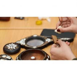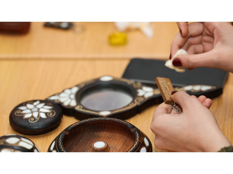 Sedefkârlık Atölyesi’nde Safiye Açar ve Mehmet Açar tarafından yürütülen çalışmalarda, sedef sanatının incelikleri katılımcılara uygulamalı olarak aktarıldı. İstiridye ve midye kabuklarının iç yüzeyinden elde edilen sedefin, özellikle ceviz gibi ahşap yüzeylere oyma ve kakma teknikleriyle işlenmesi; gümüş tellerle zenginleştirilerek mobilya ve objelere estetik bir değer kazandırılması süreci tanıtıldı.
